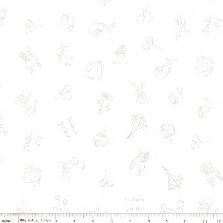 Lights On by Minki Kim for Riley Blake Designs is great for quilting, apparel and home decor. This white-on-white print features uneven rows of sewing objects.